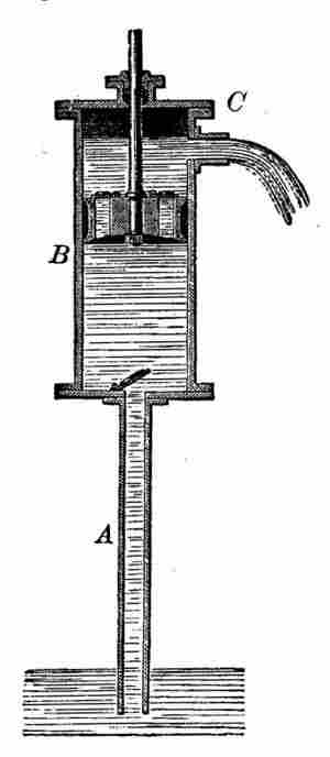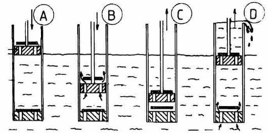 Het meest toegepaste type pomp was de enkelwerkende zuigerpomp (zie onderstaande figuur). Deze pomp bestaat uit een zuiger, een cilinder en twee kleppen, namelijk de zuiger- en de voetklep. In A staat de zuiger in de bovenste stand en gaat omlaag. De zuigerklep gaat open en de voetklep wordt dichtgedrukt. In B gaat de zuiger omlaag waarbij het water door de zuiger stroomt. In C gaat de zuiger van de onderste stand omhoog. De zuigerklep wordt dichtgedrukt en de voetklep gaat open. In D drukt de zuiger het water omhoog en wordt 'nieuw' water aangezogen via de geopende voetklep. Hierna begint de cyclus opnieuw.
